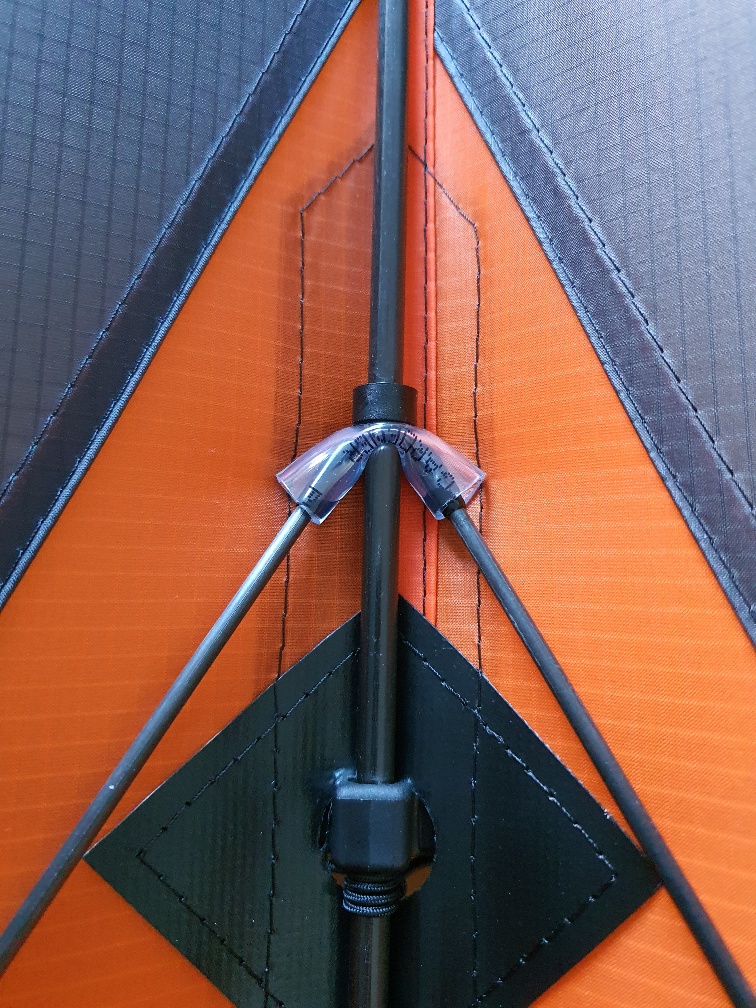 Die Stäbe zur Abspannung des Schwalbenschwanzes sind oberhalb des MK in einem Stück Schlauch gehalten. Das funktioniert, ist aber m.E. nicht ganz perfekt, zumal es auf der Vorderseite leichte Beulen wirft.