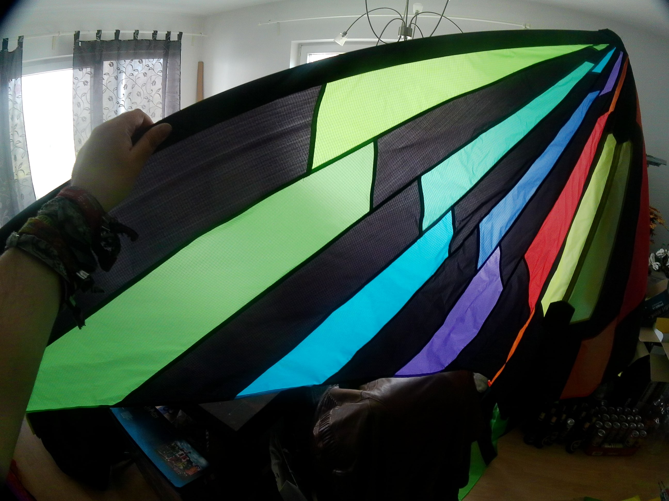 Und das Flickwark aus den alten Aldibombern leuchtet auch nach über 20 Jahren immer noch schön am Himmel. Die Löcher und Messingversteifungen der Mittelkreuzausschnitte der Aldis stören den Flug überhaupt nicht.