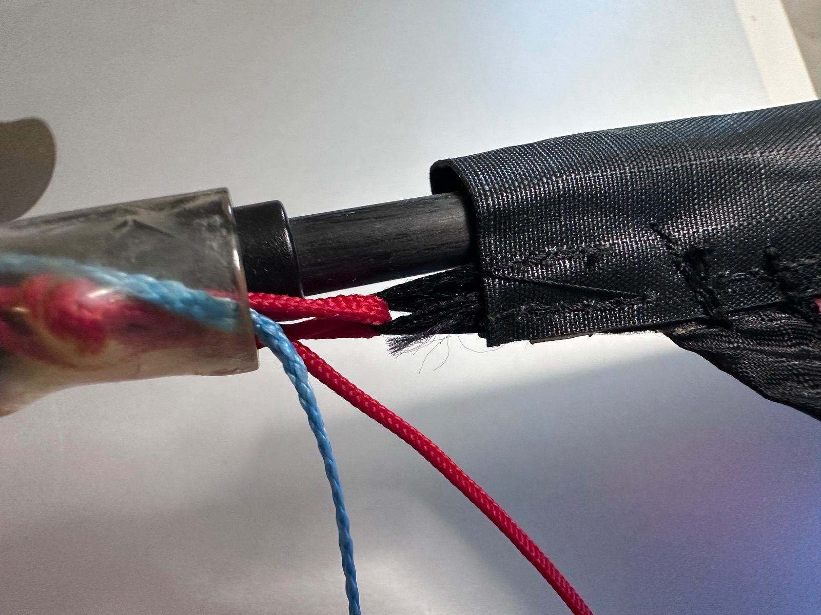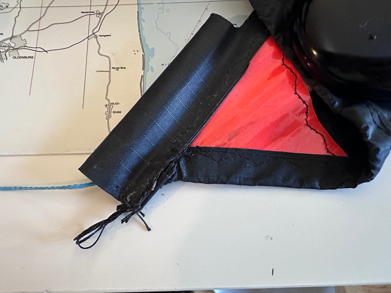 -größtes Problem, die Segelabspannung (das kleine Flachband) auf einer Seite hat sich verabschiedet, ein Segelmacher hat sich probiert, ist aber gescheitert
