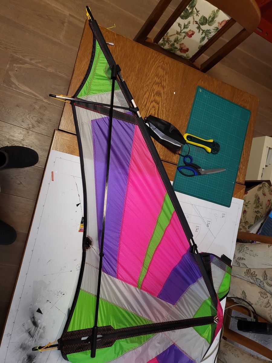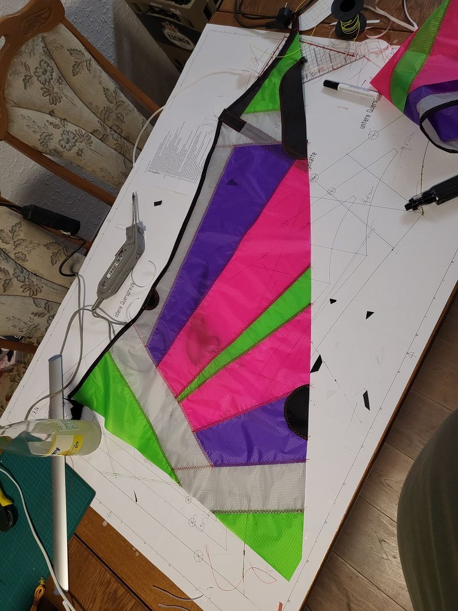 Dafür ist aus einer fixen Idee für den Hollandurlaub nun Realität geworden. Heute Abend komme ich in der Ferienwohnung an, dann muss nur noch die Waage geknüpft werden und morgen gehts dann bei Sauwetter raus... Naja, man kann nicht alles haben und im Großen und Ganzen bin ich froh, dass es regnet.So sah es Montag Abend aus, die Segel nur geklebt.