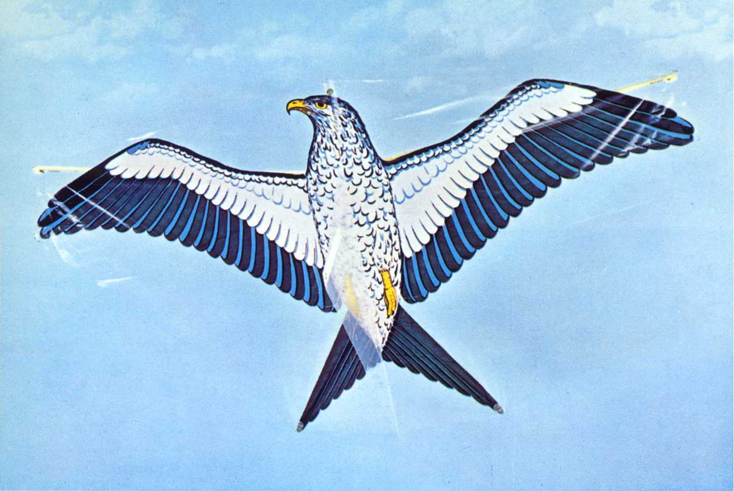 Steckbrief: Übliche Größe wie der Günther Adler, Raubvogel in Blau/weis/schwarz mit Gabelschwanz wie bei einer Schwalbe. Auch das Gestänge war zum Schwanz hin gegabelt, also der Mittelstab endete nach 2/3 und dann kam ein V-Verbinder der 2 Stäbe zum unteren Ende hin aufnahm.