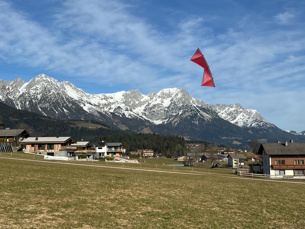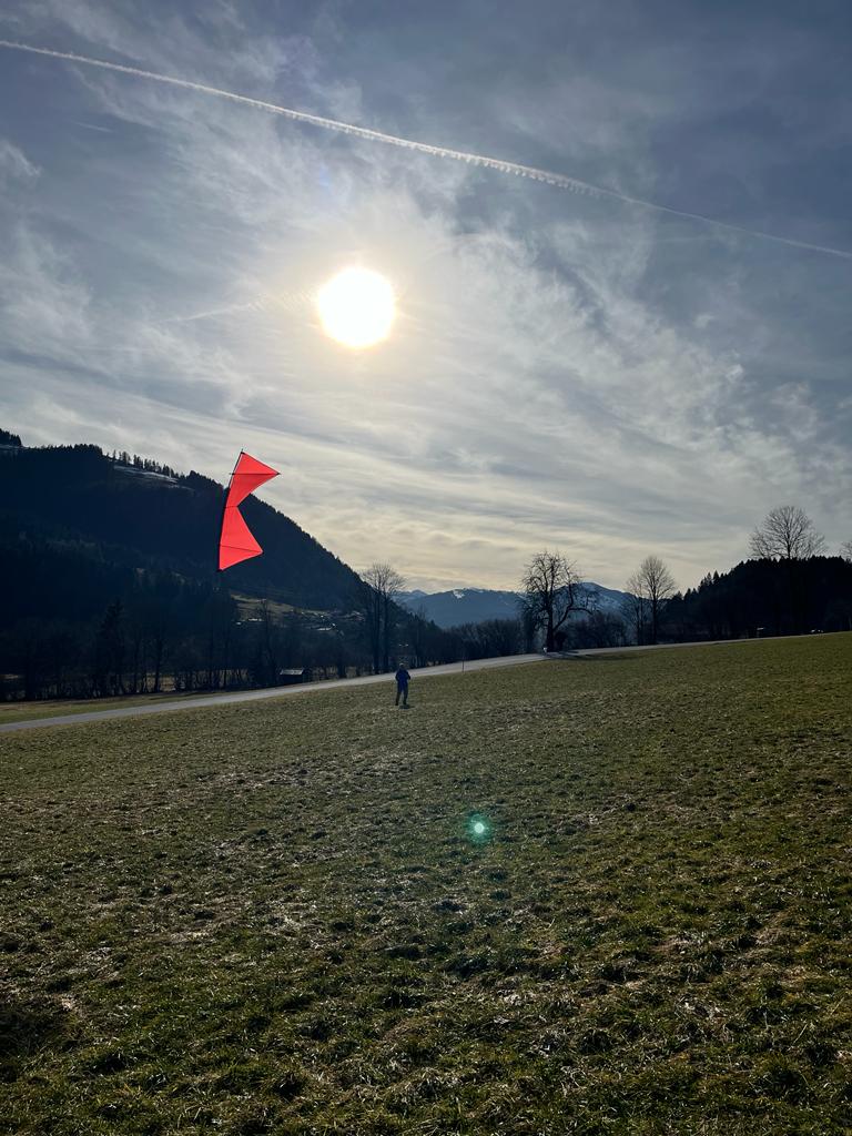 Wir sind hier auch im Skiurlaub, allerdings sind Pisten ab Mittag ziemlich weich und zerfahren, deswegen habe ich Zeit ab Mittag mal.mit den Kites auf die Wiese zu gehen.