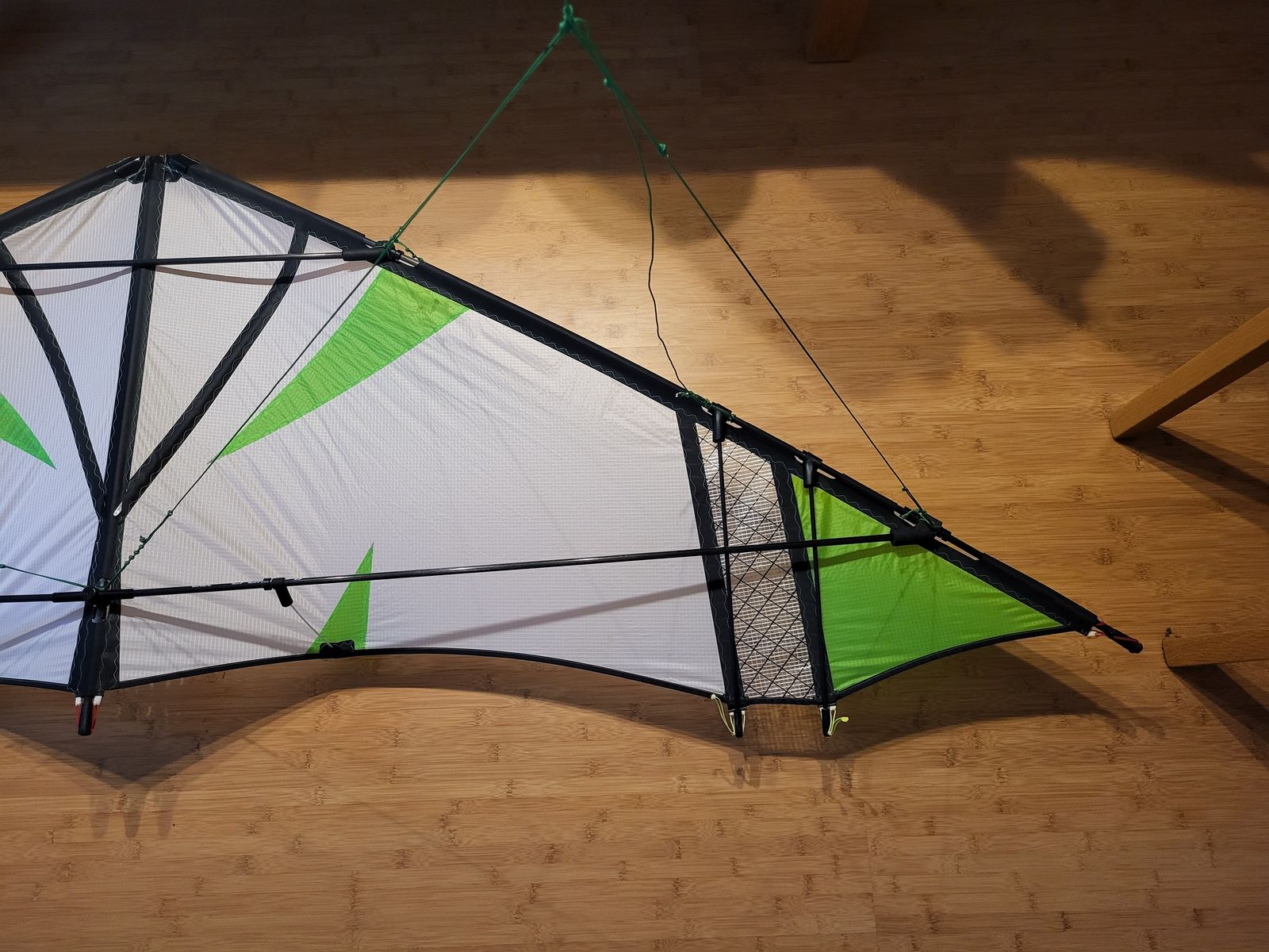 Rechte Seite ist neu. Zwei Fragen habe ich aber noch, wie dolle spannt man die Saumschnur? Und ist das richtig dass die Waage vom winglet locker ist? Meine Idee ist dass der Wind die spannt, damit der Flügel bauchig wird!?