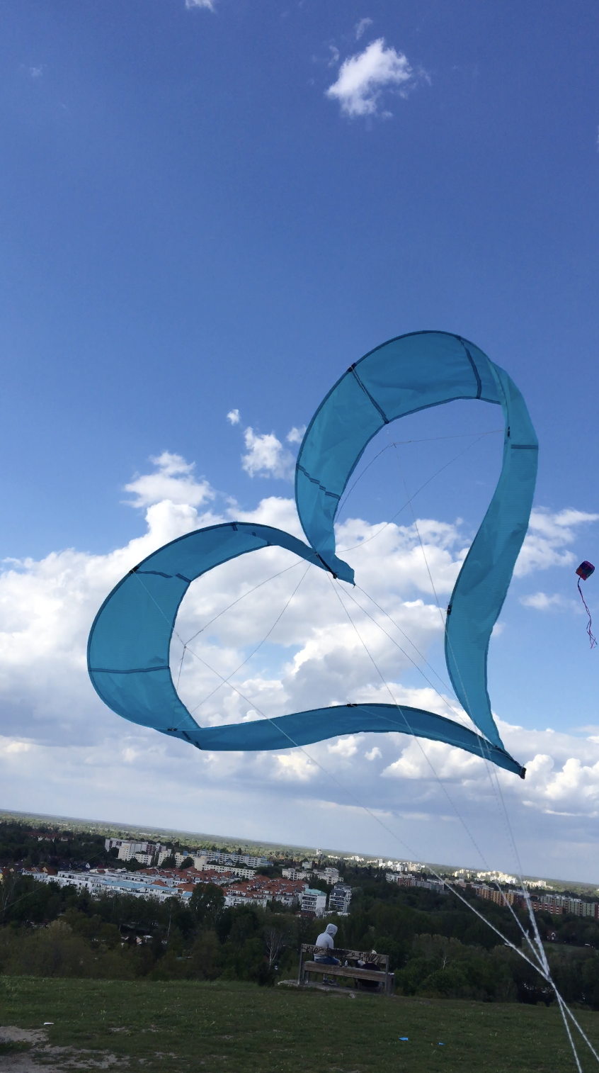 Meine Herzen fliegen am besten bei ca 8 bis 10 kmh unterer Bereich, bei 1,6er Stäbe, wenn ggf Stärkerer verbaut sind, kann herz, leitkanten nach vorne zusammen klappen, = benötigen mehr Wind, 1,6er Stäbe dann bis ca 17 kmh, ggf mus man mit zunehmenden Wind in kieltasche pö a pö Gewicht nach legen, damit herz senkt recht bleibt, und kein Schlenker, Kreis macht. Nach hinten klappt da normalerweise nichts, durch Waage,