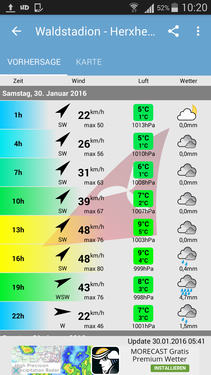 Wind war um die 8-15 km/h, erst sah das Wetter so aus (Bild) dann kam dicker Nebel. In Kombination mit Frost waren die Leinen danach doppelt so dick und der Kite total vereist
