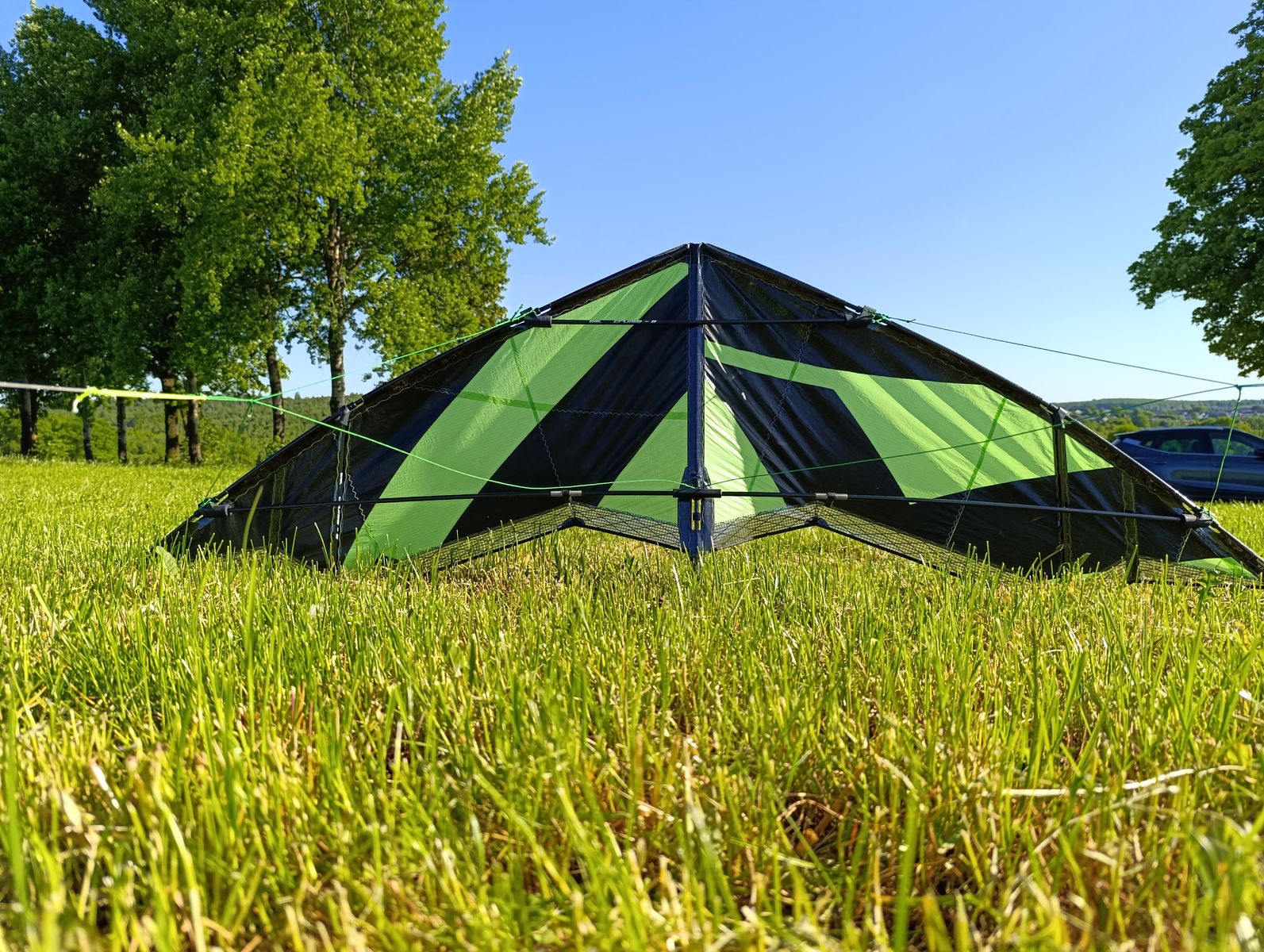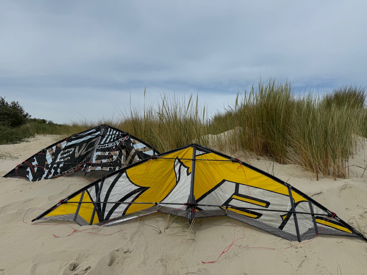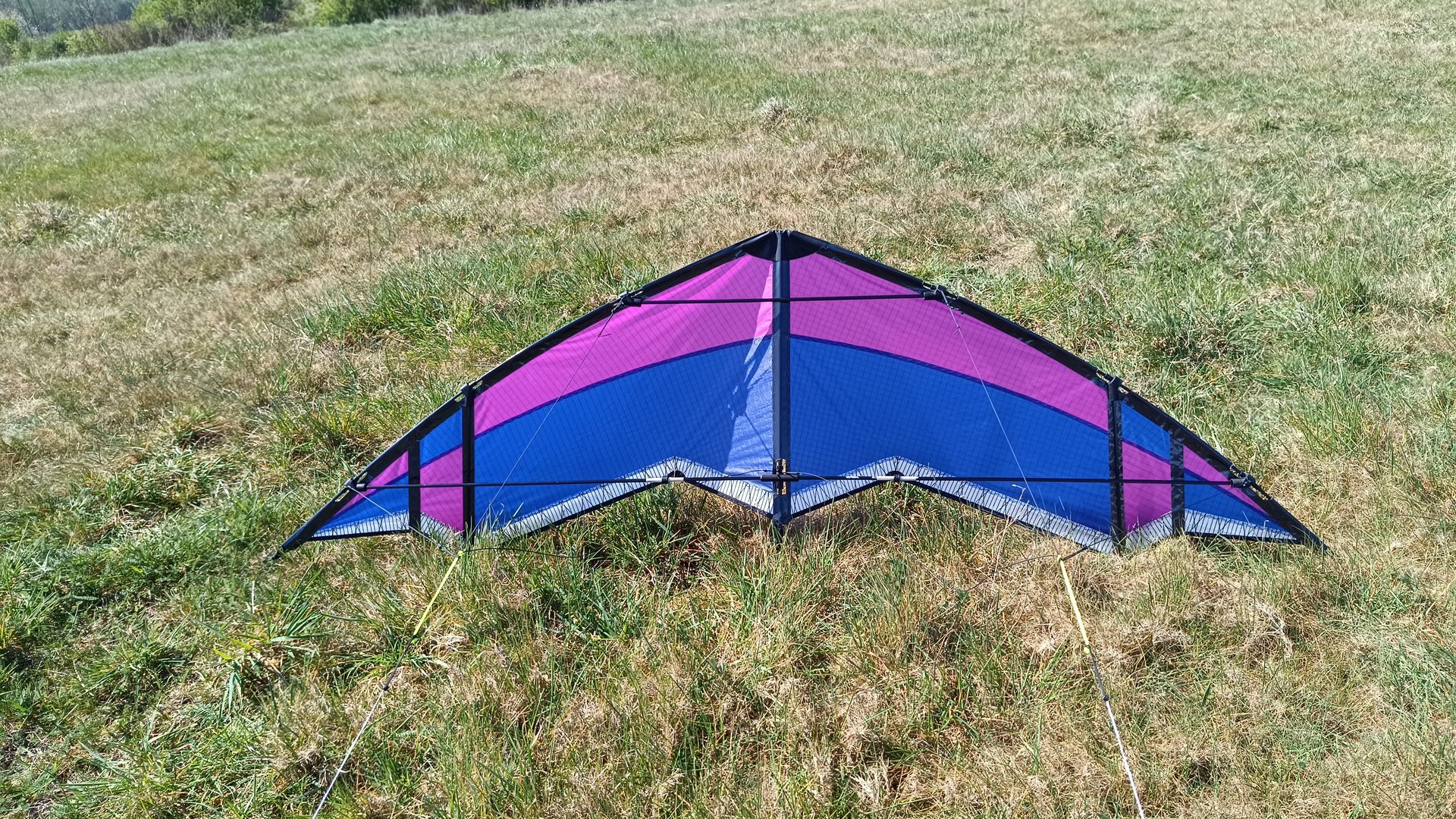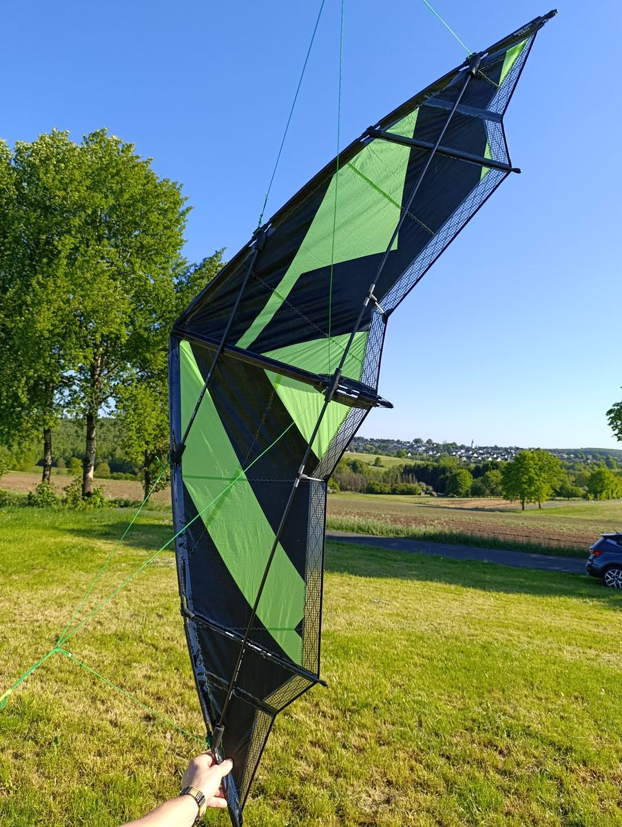 So, die Schantalle war heute noch mal auf der Wiese, konnte mich ein Stündchen loseisen. Der zweite Start gelang mir und sie nahm zügig Strömung an. Ließ sich toll fliegen und sah toll aus, klasse Vogel, Jörg! Nach ein paar Runden, die sie problemlos meisterte, wollte ich sie oben stehen lassen und dann ist sie aus der Strömung gefallen. Gut, dachte ich, einfach einen Knoten steiler. Allerdings habe ich sie nicht mehr gestartet bekommen, sie dreht grundsätzlich nach rechts trudelnd weg. Hab auch wieder zurück gestellt und alle Waage Maße auf Symmetrie geprüft. Auch der Bauch ist symmetrisch gleich tief auf beiden Segelseiten. Bin ein wenig ratlos, hab eingepackt und mir gedacht, ich schau zu Hause in Ruhe. Leinen hatte ich schon ausgeschlossen, gedreht und trotzdem trudelt dat Schantalle nach rechts.