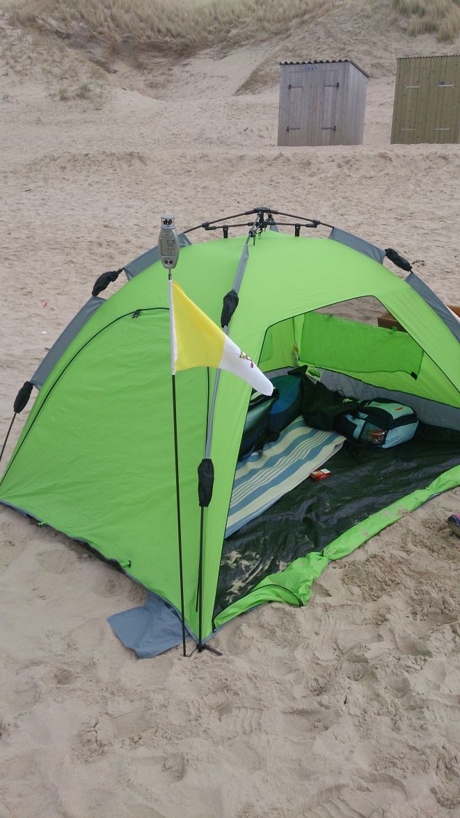 Die mitglieferten kurzen Heringe habe ich erst gar nicht verwendet, sondern habe direkt lange dünne Sandheringe verwendet. Die Sandtaschen brauchte ich bei den Windverhältnissen auch noch nicht. Die sind also noch sandfrei.