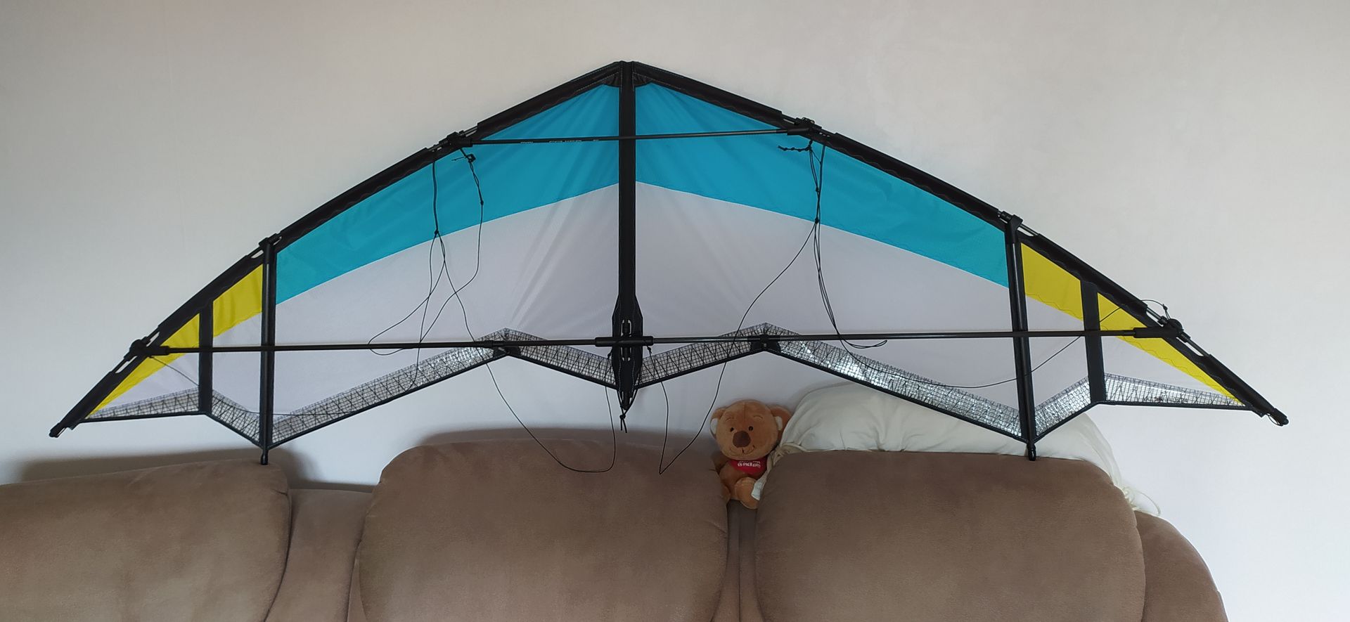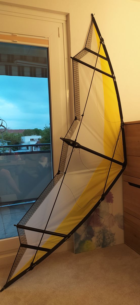 Bis dann gestern bei gerade mal 2 bft zumindest dat große Schantalle zum ersten Mal den Boden so richtig verlassen konnte. Nach dem 3. Stratversuch hatte ich dann die Waage auch soweit angepasst, dass dat große Schantalle zumindest in der Windefenstermitte sauber flog. Am Windfensterrand hatte ich aber immer mal wieder mit abgerissener Strömung und entsprechendem Kontrollverlust zu kämpfen. Aber wenn wir mal um die 3 bft haben, werde ich das Feintuning an der Waage vornehmen. Auf jeden Fall habe ich schon mal eine Idee davon bekommen, was in dem Flügel steckt.