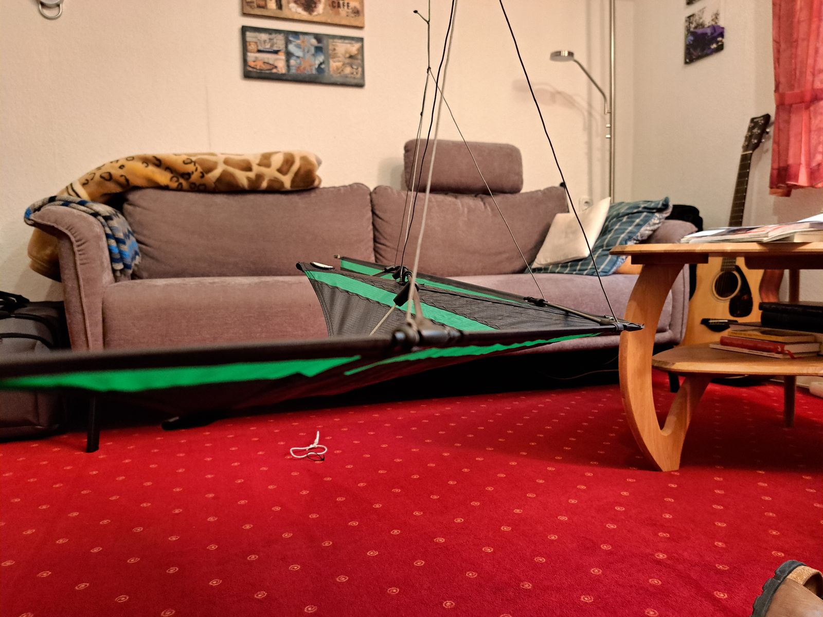 Nichtsdestotrotz kann man ihn auch bei dem Wind an leichten Leinen fliegen, wenn er etwas flacher eingestellt ist.
