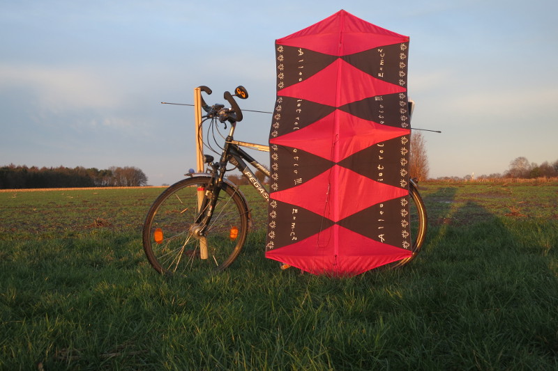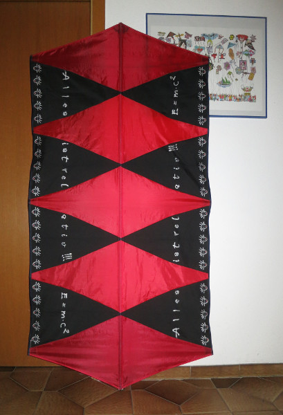 Herr Einstein "Alles ist relativ!!!" war mal ein Regenschirm vom Saxonia Media-Team. Mit 10 weiteren Dreiecken von zwei roten Regenschirmen wurde daraus ein verlängerter Rokkaku. Auch das CFK-Gestänge kann komplett von zerlegten Regenschirmen (3,5 & 4 mm) eingesetzt werden. Mit einer Dreipunktwaage ist er dann recht stabil. Auf dem Foto sind ein kommerzieller 6-mm-Stab und 3,5-mm-CFK-Stäbe vom Regenschirm eingesetzt.Größe 87 x 177 cm