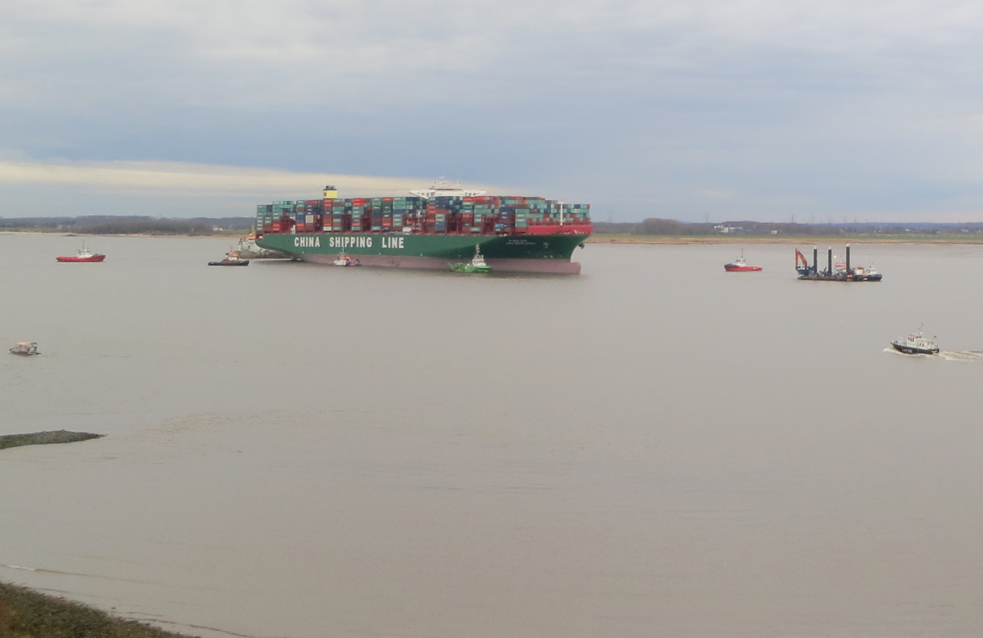 Fast eine Woche lang lag die "Indian Ocean" vor Grünendeich bei Stade nach dem Ausfall der Ruderanlage auf Schiet. Zwei Schleppversuche scheiterten. Erst mit der Springtide in der Nacht am 09.02.2016 und umfangreichen Vorarbeiten kam das Containerschiff mit Hilfe von 12 (!) Schleppern wieder von der Sandbank zurück ins Fahrwasser. Mit dabei waren 2 Hochseeschlepper!
