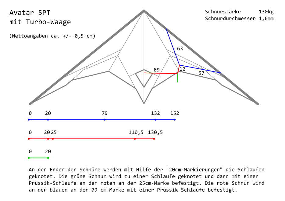 Die Anleitung beschreibt das ganze auf Basis der Schnurlängen vor dem Verknoten der Waage. Um das richtige Resultat zu erhalten, sollte eine möglichst gleich dicke Waageschnur verwendet werden. Nach meiner Messung hat die originale Schnur einen Durchmesser von 1,6mm. Ist die Schnurr dünner, sind die Knoten kleiner und die Waage wird etwas länger. Das kann je nach Schnur schon mal ca. 5mm Differenz ergeben.