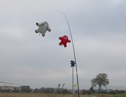 So ein kleines Bändsel mit zwei Schlaufen kannst Du dann z.B. aud en Zentralen Punkt der Windspielwage anbuchten. Das andere Ende zusammen mit der dünnen Flugleine des Windspiels an den Karabiner, ab auf die Lifterleine damit und ab geht die Post. -