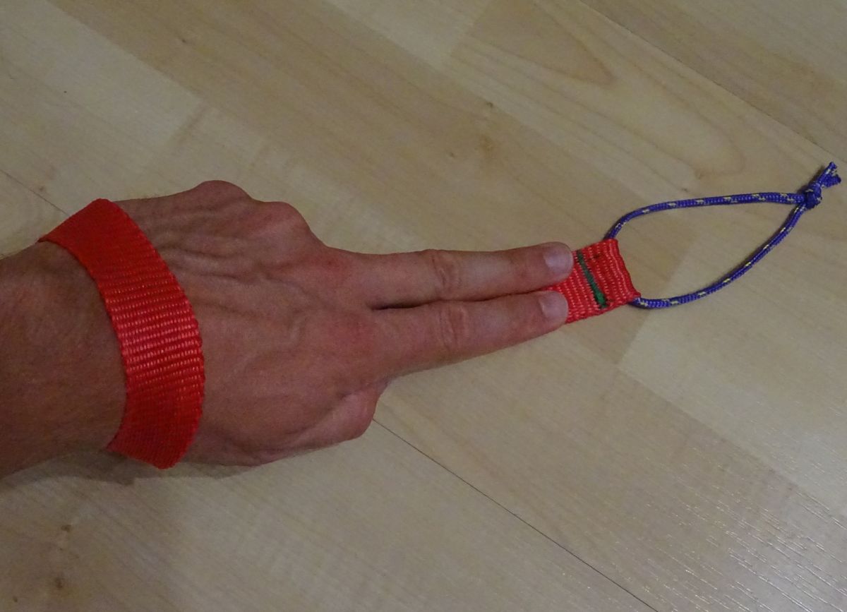 Ich bin, trotz recht schmaler Handgelenke, wie in Pauls Anleitung auf 65cm Band je Schlaufe gekommen.