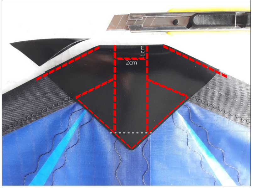 10cm x 10cm LKW-Plane einmal diagonal Falten, auf der Rückseite die untere Spitze kappen (graue Linie), damit der Tunnel für den Kiel offen bleibt. Links und rechts einen Leitkantenschnitt, und zum Schluss die Nähte (rote Linien). Die Nahtführung kann je nach Modell variieren. Hierzu unbedingt den jeweiligen Bauplan beachten! Das hier gezeigte Beispiel findet sich in ähnlicher Form am Vortex und am EOL.