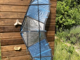 Material ist in der Mitte und in den letzten Paneelen 68 Gramm Dyneema Composite (früher Cuben Fibre). Gedoppelt aus dem 34 gramm Material und verklebt mit dem Spezialklebeband von 3M für Dyneema Composite (Cuben fibre). Der Rest ist Dyneema Composite mit 50 Gramm.