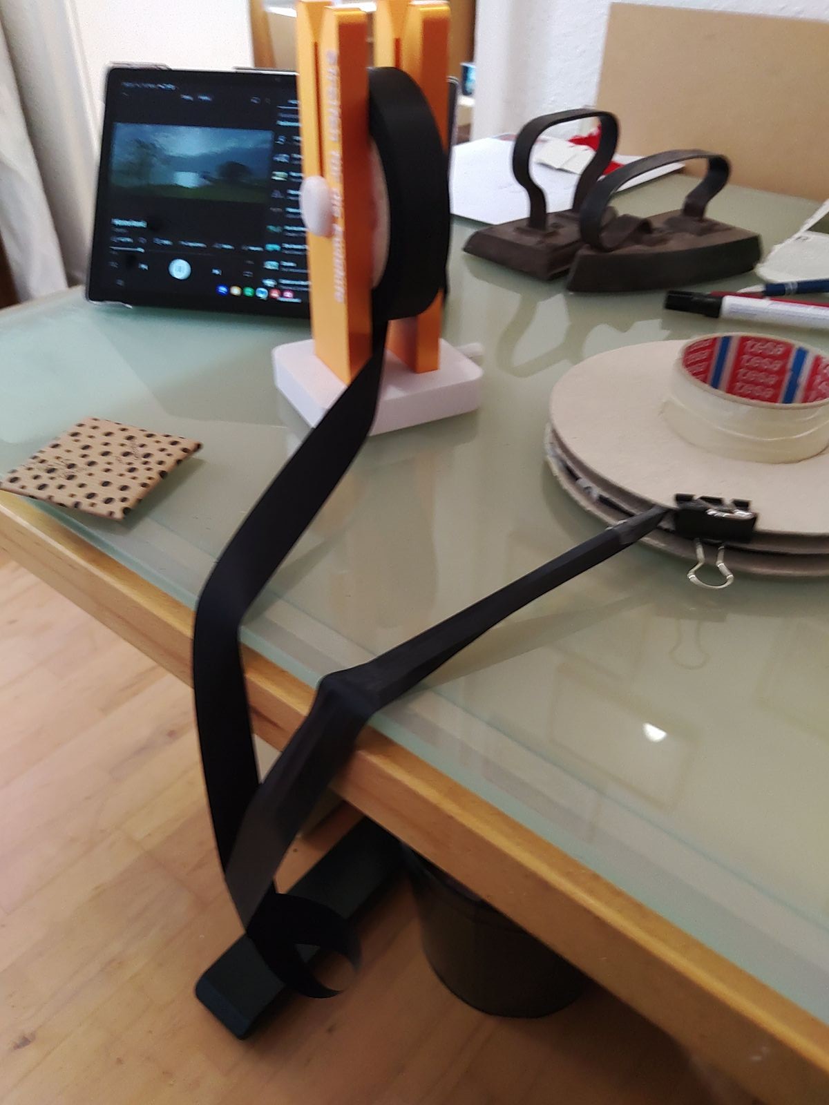 ich fand das Thema auch so gut (habe mich auch schon über das ständige Nachführen von Saumband geärgert) und habe mir im 3D-Druck einen kleinen horizontalen Abroller gebaut.