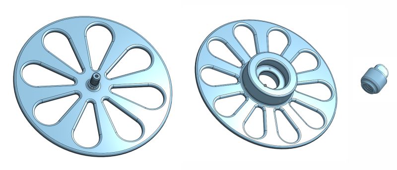 2. Der Teller für die Saumbandrolle enthält eine Lagerschale für ein Kugellager Typ608 . Der Teller hat einen Durchmesser von 14cm und ist 4mm dick. Die Aufnahme für die Spinnakerbandrolle hat einen Durchmesser von 49.5mm und ist 16mm hoch.