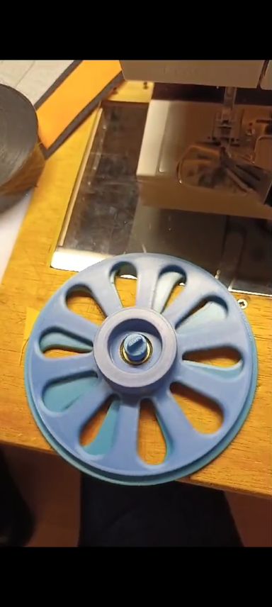 Die Aufnahme für den Pappkern hab ich im 3d Drucker gemacht. Sie ist erwas höher. Dadurch konnte ich die Scheiben auf der Drehbank einspannen und rund drehen. Das ist viel besser als nur mit der Stichsäge ausschneiden.