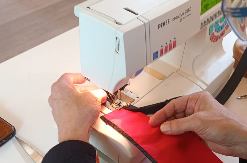 Damit läuft das Band direkt in die Nähmaschine. Durch die Stellschraube kann man ein wenig rechts-links verstellen um das Band unter der Nadel korrekt zu positionieren.