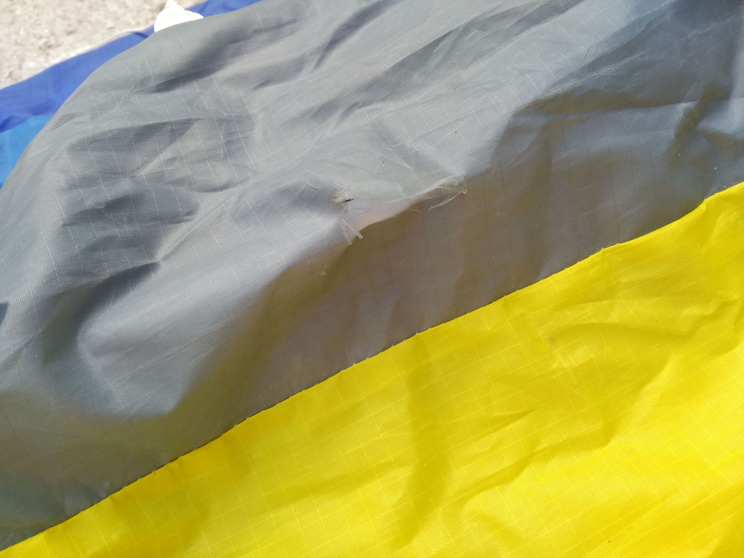 Den Riss im Segel kannst du mit Spinnakertape reparieren. Das bekommt du im Drachenladen oder im Seglerzubehör. Gibt es auch in vielen Onlineshops, einfach mal googeln