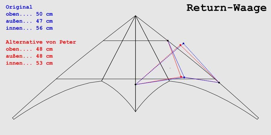 Auf dem Trickfliegertreffen in St. Peter Ording hatten einige Piloten die Gelegenheit einen Return mit den von Peter beschrieben Modifikationen zu fliegen (Bauplan: [Return] - ein neuer Trickdrachen). Ich habe daher am Wochenende meine Returns (5PT und 3PT) nach fast einem Jahr wieder aus der Drachentasche hervorgeholt und an beiden die neuen Waagemaße getestet. Ansonsten habe ich die beiden Kites nicht umgebaut. Fazit: Die Waage-Abmessungen von Peter gefallen mir!