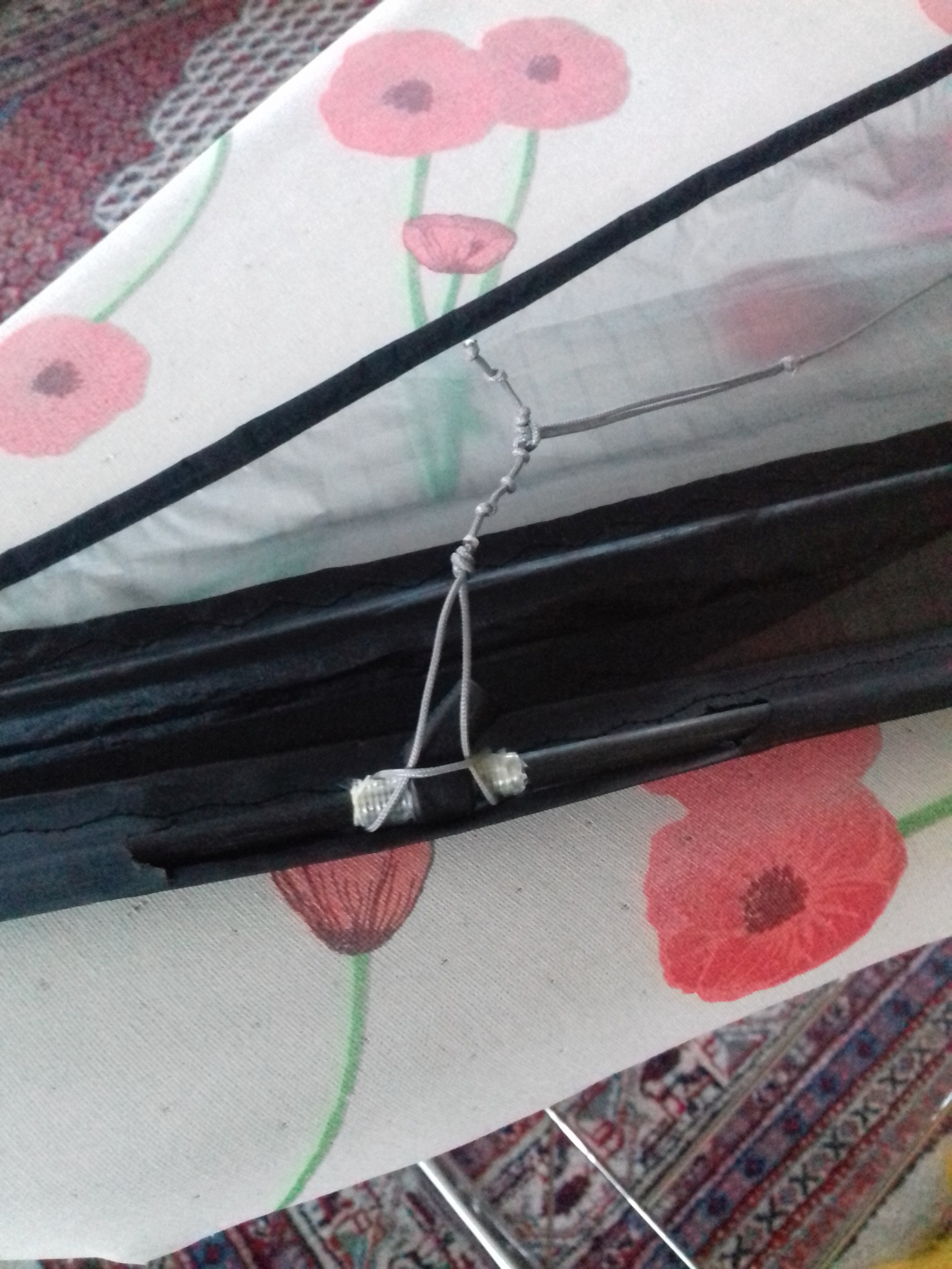 Der innere wäre insgesamt 64cm lang, und 4 cm von dem Punkt entfernt, an dem die 3 Schenkel sich treffen, wird ein Tampen eingebuchtet, an dem die Flugleine befestigt wird?