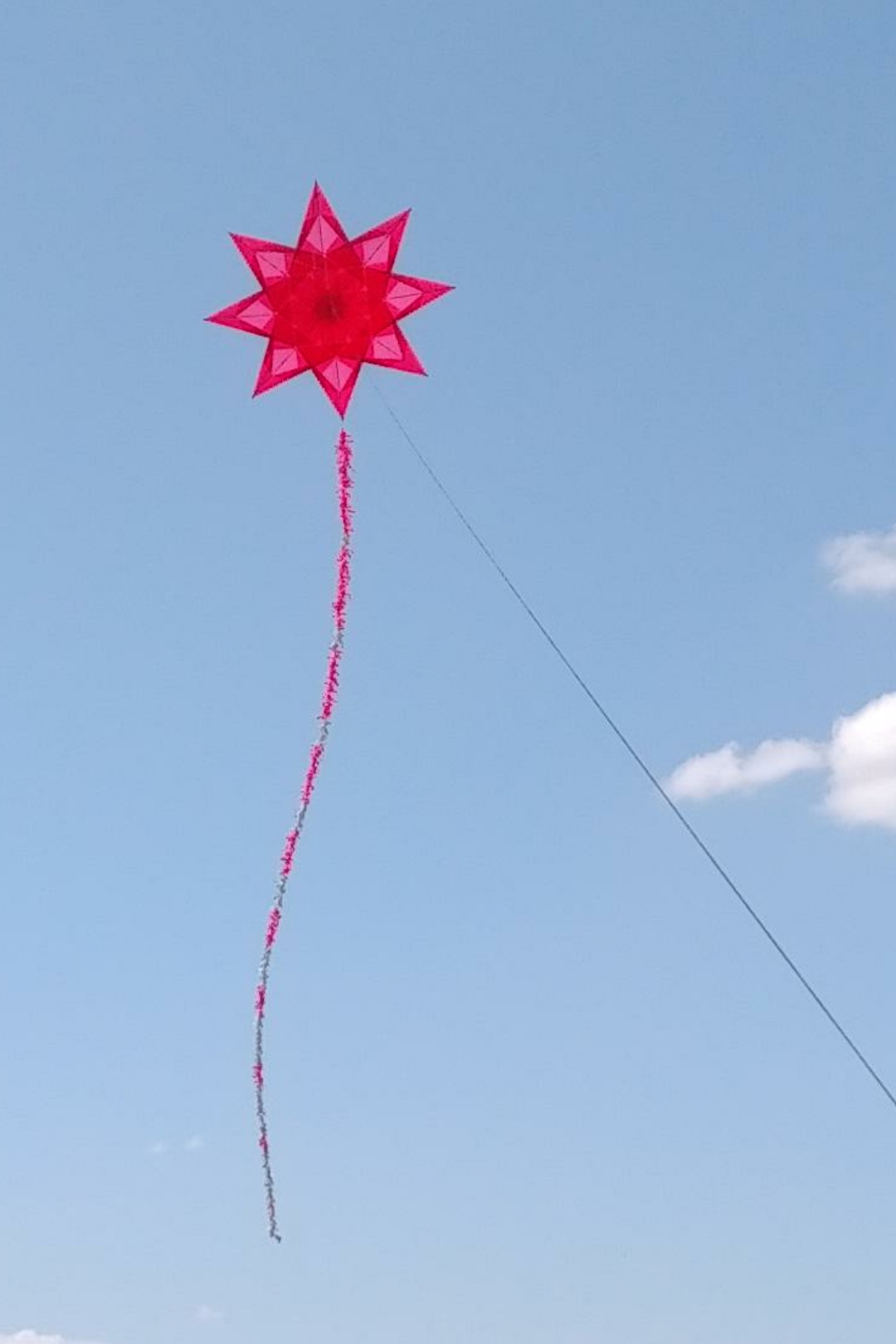 heute an dem herrlichen Sonntagnachmittag bei fast 27 Grad und einem kräftigen Wind über den Eifelhöhen, konnte ich meinen Stern endlich in die Lüfte entlassen. Ich habe mich entschlossen einen Waage mit 2 Spitzen zu bauen und nach ein paar wenigen Versuchen war auch direkt der Waagepunkt gefunden.