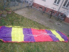 Vergangenen Sommer im Kitesurfurlaub in Italien durch einen Kitestore schlendernd, stiess ich in der hintersten, dunkelsten Ecke auf eine Ramschkiste, die mich, mit verschiedensten, in jeglichen Neonfarben leuchtenden Spinnakerstoffen vollgestopft, sofort in ihren Bann zog. Da war alles drin, was heutige Safetyrichtlinien verbieten würden. Von Tubekites mit lediglich 2 Leinen über Matten mit irgendwelchen exotischen Lufteintrittsventilen bis hin zu sonderbarem Zubehör. Darin herumwühlend hatte ich plötzlich eine Etikette von Advance in der Hand und sofort machte sich Gänsehaut über meinen gesamten Körper breit. War es das, was ich dachte? Und tatsächlich! Den Verkäufer gefragt, ob ich dieses Knäuel draussen ausbreiten dürfte, erbot sich mir einen Anblick, der mich sofort wieder in meine Jugendzeit zurückversetzte. Das Ding musste ich haben, um jeden Preis! Glücklicherweise reichten jedoch bereits 60 Euro für einen Besitzerwechsel, denn der Verkäufer konnte weder sagen, was das für ein Ding ist, woher es stammt, noch was ich damit anfangen wollte ![]()
