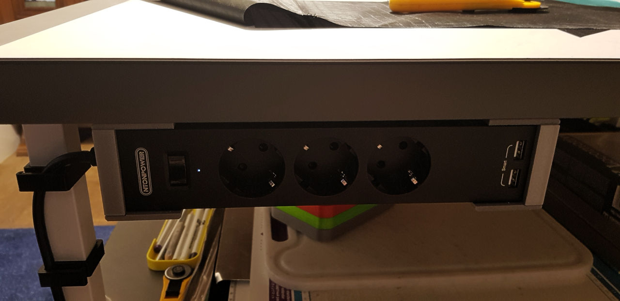 Da ich auf dem Tisch auch mal den Lötenkolben benutze, die Leuchtplatte, oder den Schneidplotter, braucht es Strom. Dafür habe ich unter der Platte eine Steckdosenleise montiert. Verwendet habe ich dafür 3D-gedruckte Halter.