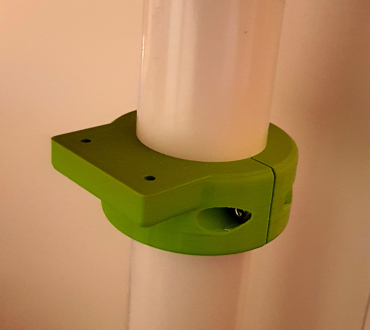 Deswegen jetzt Versuch Nr. 2: Ein zusätzliches Ablagebrett! Dafür habe ich "Schellen" im CAD gezeichnet und gedruckt, die ich um die Adils-Tischbeine von IKEA schrauben kann. Vorteil: Ich muss die Beine nicht anbohren, oder sowas. Und anheben muss ich sie auch nicht, um was aufzufädeln. die Dinger sehen so aus: