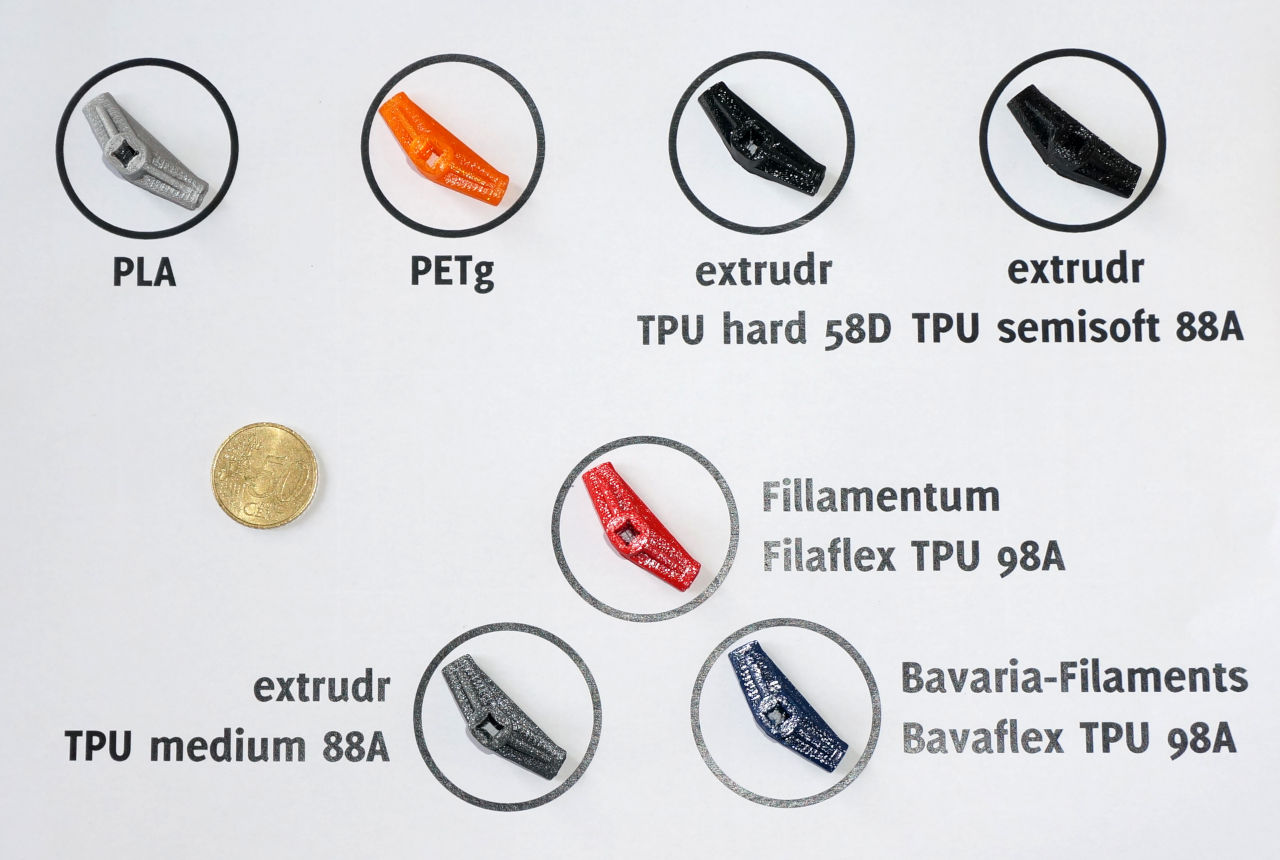Ist ein elastisches Material, etwas schwerer zu drucken als die anderen. Ich würde es nur mit Direktextruder machen, nicht mit Bowden. Extrem gute Layerhaftung, und in verschiedenen Härtestufen zu bekommen. Ich probiere gerade 98A aus, das finde ich richtig geil. Kann natürlich für manche Anwendungen noch immer zu weich sein. Ist so vergleichbar mit "Schuhsohle oder Autoreifen". Gibt es aber auch noch deutlich weicher!
