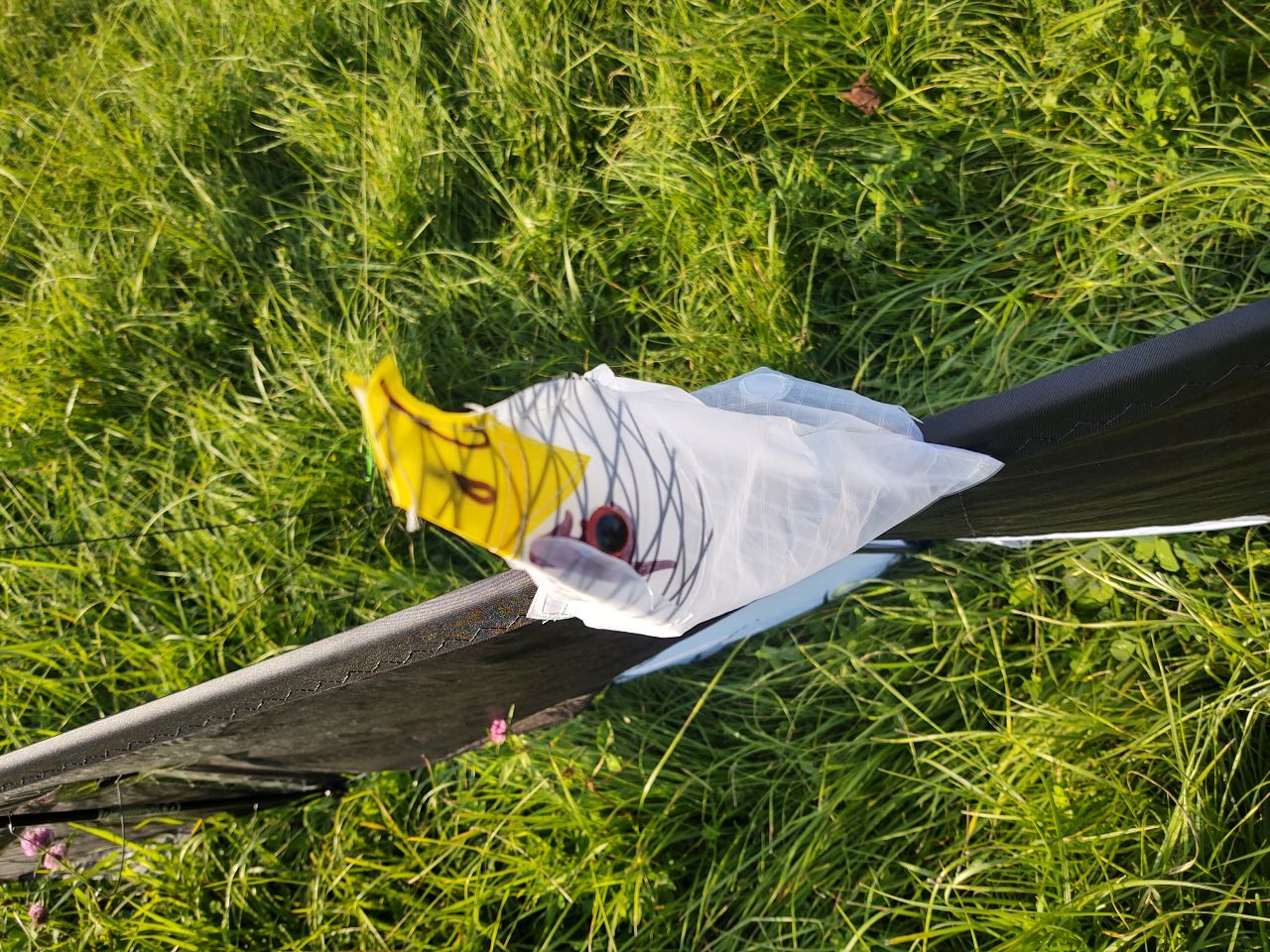 Da stecken Flach-CFK an bestimmten Stellen, Zahlreiche Mylarverstärkungen mit Saumschnur eingezogen und vernäht, Abspannungen über Klettbänder, Gummi mit Federn drin, dazu passende Endkappen, der Kopf ist flexibel gehalten, damit er sich bei einem Crash verbiegen kann, aber nicht kaputt geht. Cooler Nebeneffekt ist auch, dass er im Flug etwas zur Seite gedrückt wird und sich dann wieder ausrichtet, was die Illusion noch weiter verstärkt.