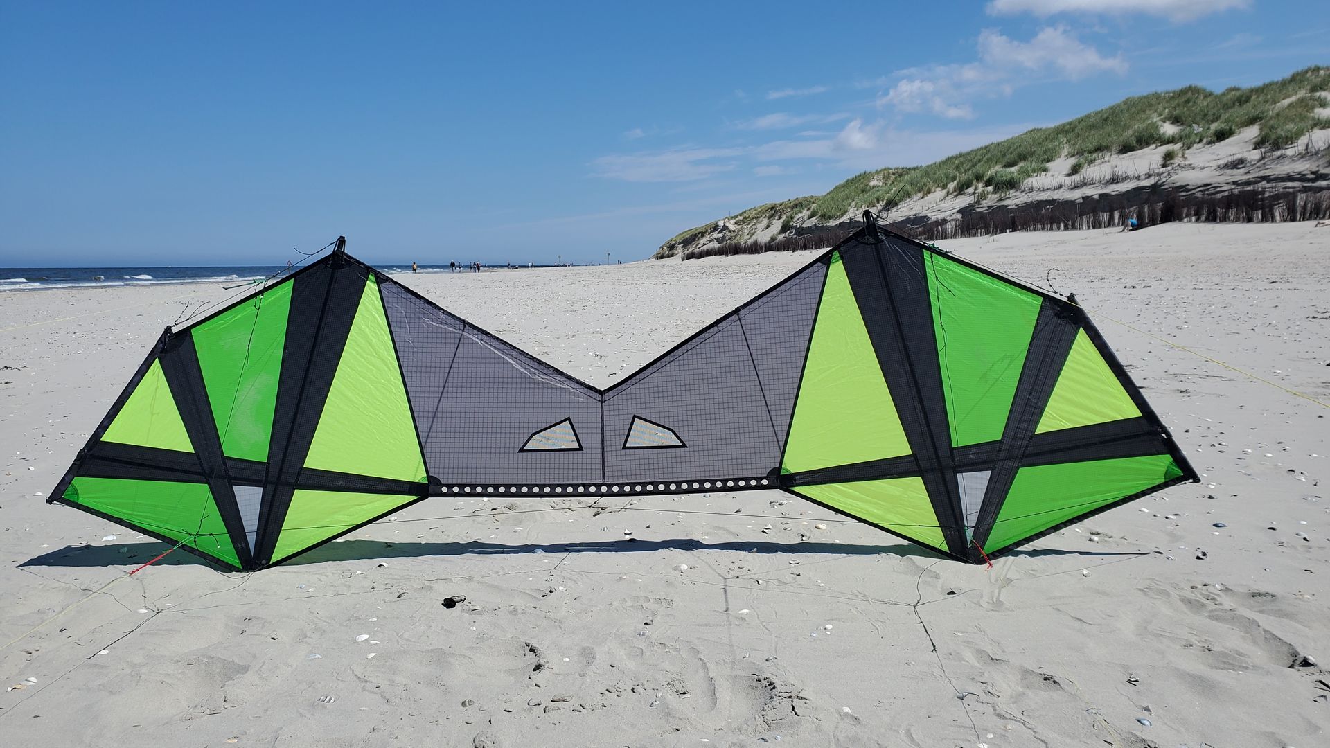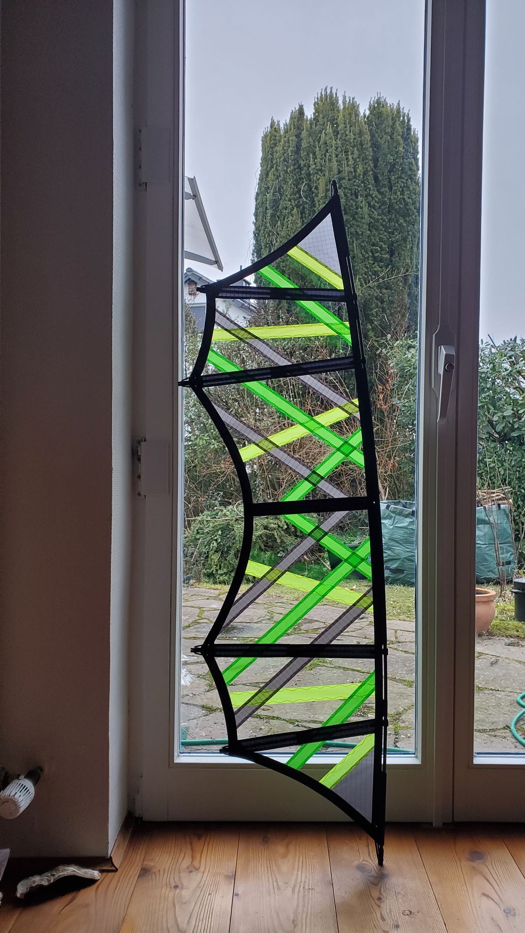 Ich wollte meinem Sohn mal einen Sturmkite bauen und da meine 180er Streifenzicke bei 28-35 kn zwar sehr gut lief , aber schon ordentlich Druck aufbaute , sollte es was sein , das eher in einem höheren Windbereich einsetzbar ist , nämlich dann wenn der Wind fürs Windsurfen zu stark ist . Also musste der Kite kleiner werden . Ich nahm hierfür mein 150er Minisuperblast Shape mit der geänderten äußeren Vertikalen , welcher als Standard extrem gut lief . Das ganze mit 3 cm Streifen statt 4 cm sollte einiges aushalten