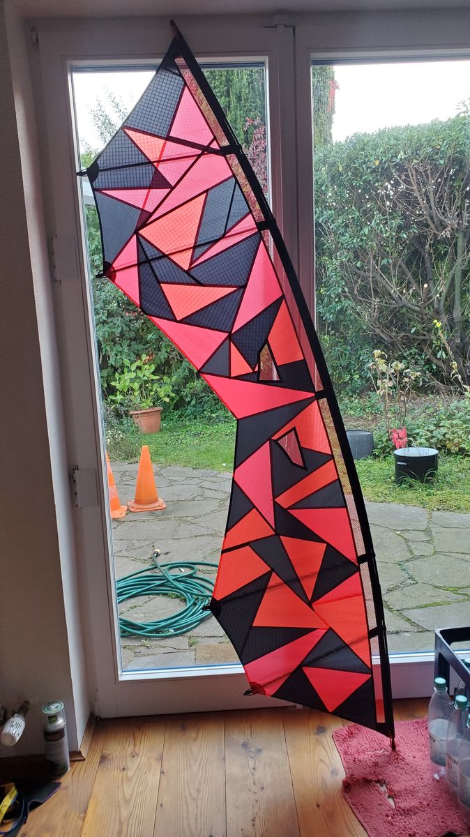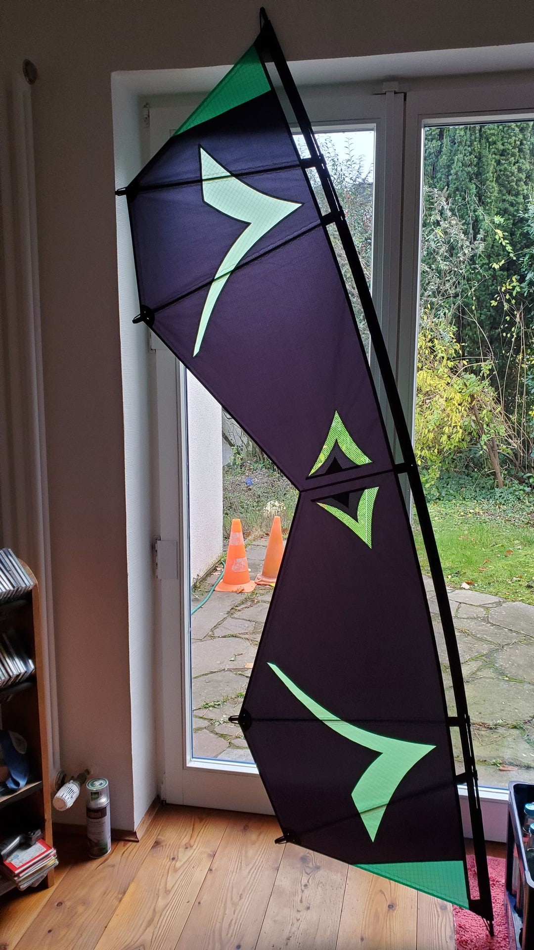 Ich habe nochmal ein neues Shape gezeichnet und in Tuch umgesetzt, probehalber aus Resten zusammengetackert . Spannweite wird 220 cm sein und Höhe so um die 55cm. Der Bogen in der Leitkante ist sehr ausgeprägt und die niedrige Höhe wird wohl gut für Flickflac sein .