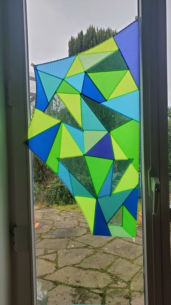Ich zeichne mir das nicht vorher an , das ergibt sich aus den Resten und der Farbstimmung die ich erzielen möchte , hier speziell habe ich versucht eine ähnliche farbliche Zusammenstellung wie beim alten Kite hin zu bekommen . Mache mich da aber auch nicht verrückt . Die Gazefelder sind rechts und links identisch , die habe ich auf dem Plan eingezeichnet . Ich habe nicht den Eindruck das die unterschiedlichen Tuchecken R.und L. das Flugverhalten beeinflussen , aber ich habe immer wieder den Eindruck , das die Flickwark Kites besonders gut fliegen und denke das sich das Flickwark Tuch durch die vielen Kreuz und Quer laufenden Nähte positiv auf das Flugverhalten auswirken .