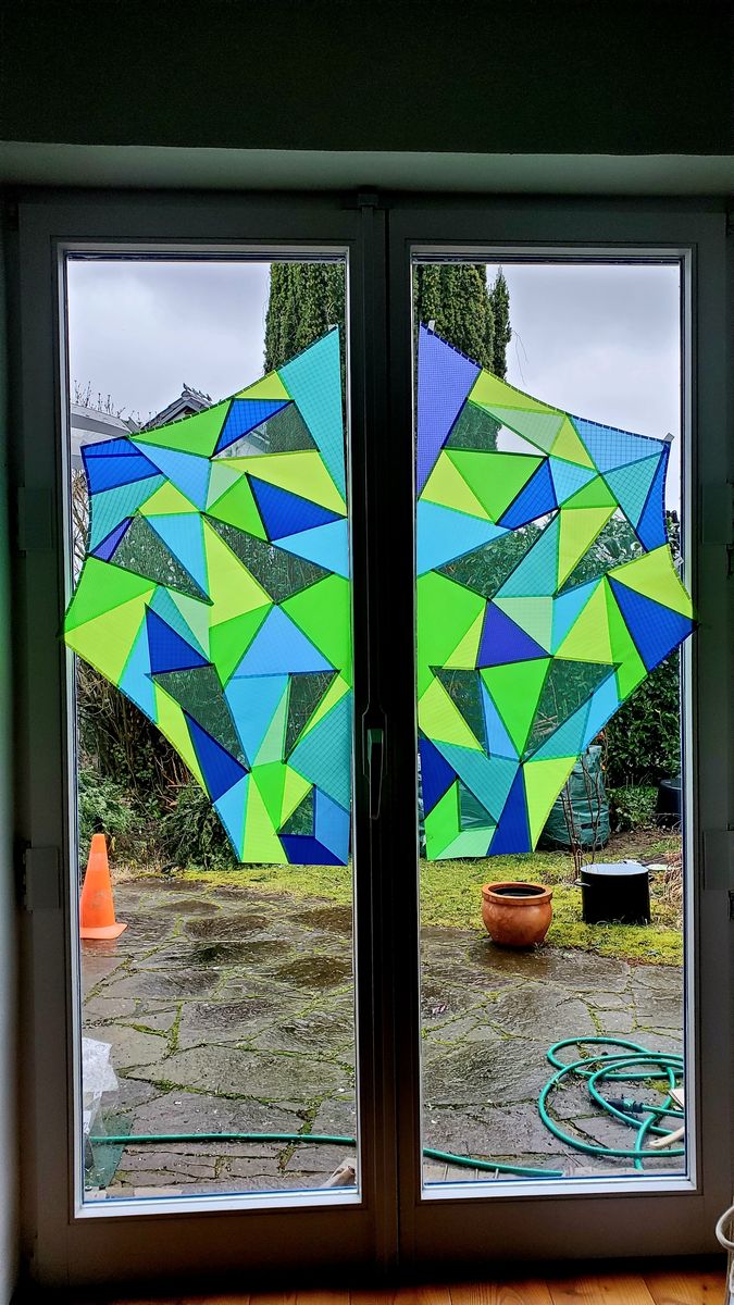. Die erste Hälfte ist geklebt, Flickwark ist schon aufwendig, aber durch den unterschiedlichen Fadenlauf glitzert es herrlich am Himmel.Und neue Hälfte