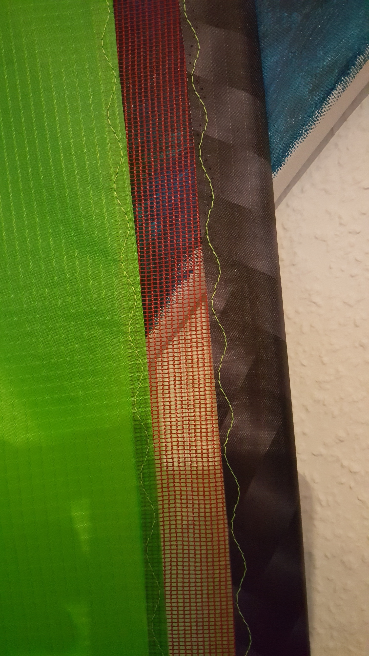 Ich habe auch noch was gebaut , einen 240er Restless als Leichtwind Kite, dafür habe ich die 70D Spinnaker in Carbonoptik als Leitkantentasche verbaut und leichte rote Gaze von Extremtextil, mit 400er Leitkante und 800er Vertikalen komme ich auf 175 g , Waage fehlt aber noch , Tuch ist Schikara und Skytex 40 .