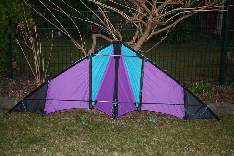Gestern kam mein brandneuer S-Kite GSI mit Segellatten von Knicki an. Abends spät noch schnell aufgebaut - eine interessante Bestabung: LKs in 5 mm, UQS in 6 mm, OQS sogar in 8 mm. Die Schlauchverbinder für OQS und zur Aufnahme der 5 mm Winglets haben etwas Archaisches, versehen aber bestens ihren Dienst. Alles sitzt schön straff und gleichmäßig. Die Verarbeitung ist sehr gut. An minimalem Wiesenschmutz an beiden Endnocken erkenne ich, dass Knicki den Kite eingeflogen hat (danke!).