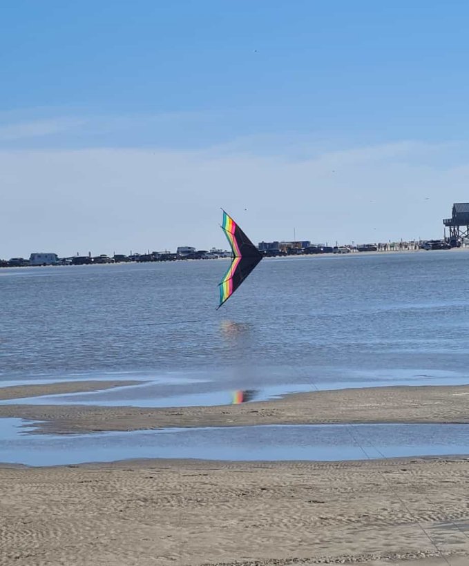 Es schaut schon klasse aus, wenn man knapp überm Wasser fliegt und sich die Farben des Segels in den Pfützen spiegeln.