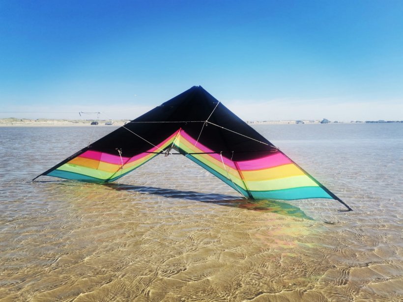Es schaut schon klasse aus, wenn man knapp überm Wasser fliegt und sich die Farben des Segels in den Pfützen spiegeln.