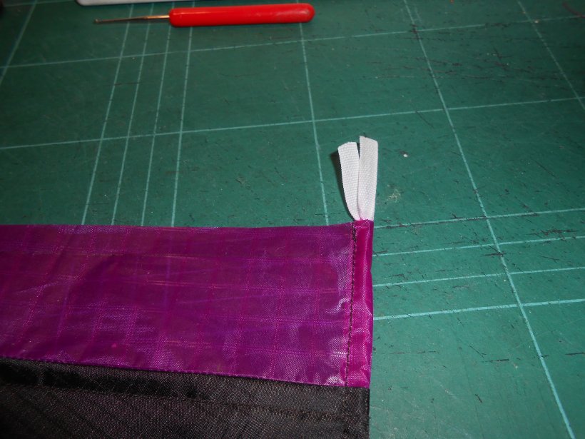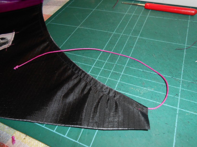 Da ich nicht mit Nadel und Kneifzange rumhantieren will, benutz ich einen 1 mm gewickelten GFK Stab als gaaanz lange Nadel. Die Saumschnur mit einem Knoten versehn und mit Kreppband an den GFK Stab kleben. Dann den GFK Stab einfädeln in den Tunnel. Der Stab ist äußerst flexibel und wer möchte kann ne entsprechende Gummikappe verwenden, dann flutscht der gut durch.