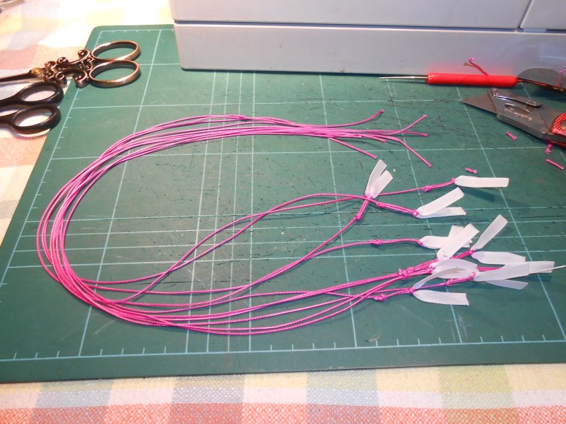Hab dann als erstes angefangen die Jetecken zu machen und sie passenden Spannschnüre für den Saum herzustellen.