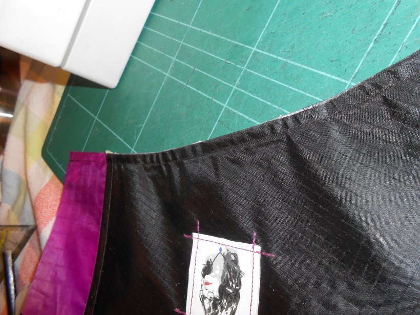 uns natürlich das Bild von Sabine auf den linken Jetecken... ma kann sehn, ich hab auch passenden farbigen Faden genommen schwarz für Unterfaden und lila für den Oberfaden