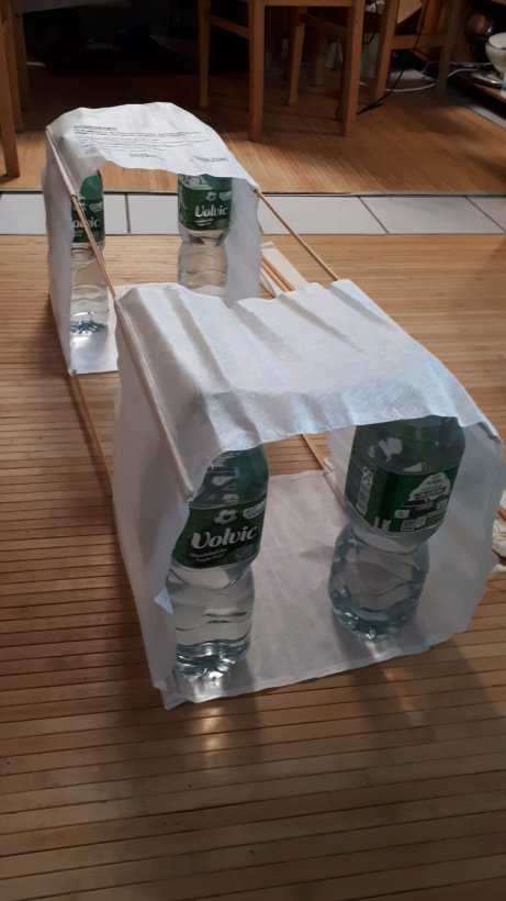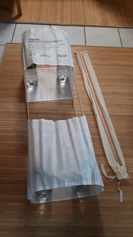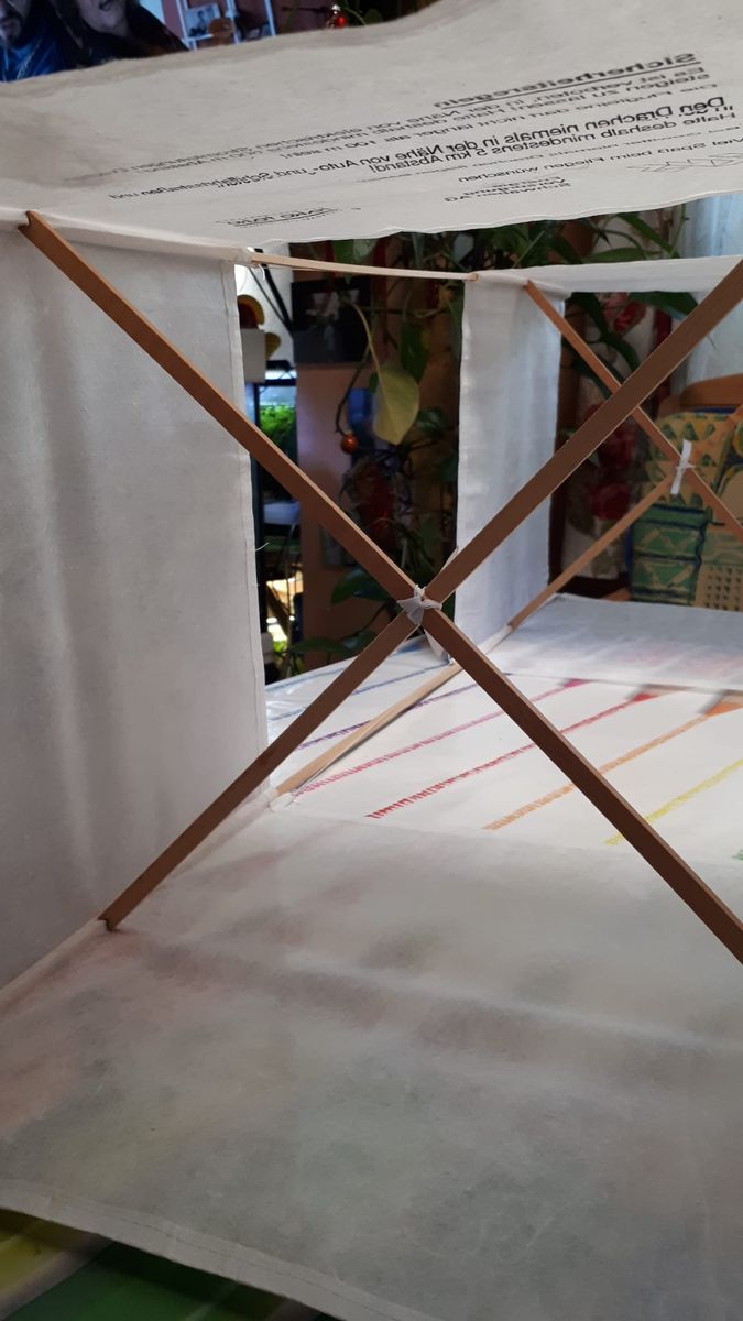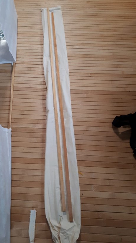 Was ich nach der Landung noch machte, die untere Leine (von Kielende zu Kielende) etwas kürzer gemacht, die verhindern soll, dass die beiden äußeren Kästen mit der Segelspitze sich zum Inneren Kasten drehen und so der Drache nicht gerade ist.