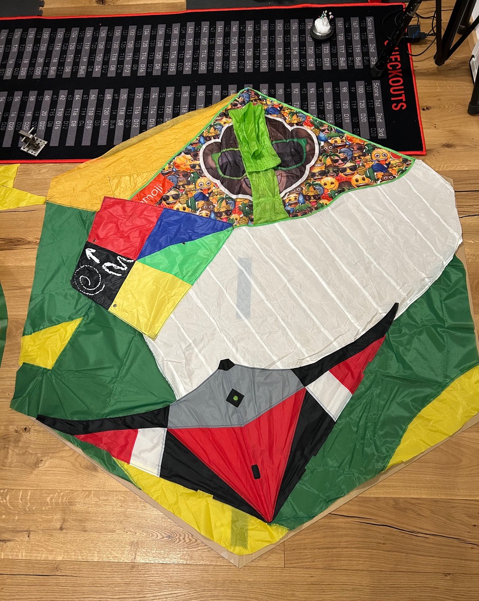Die Idee ist es eine Art Spike Ball nach Phil Womack/Ralf Dietrich zu bauen, der aus möglichst vielen recycelten Drachensegeln und Stoffresten besteht, etwas inspiriert durch den Flaki von LastMohawk. Der Ball soll später etwa einen Durchmesser von 4m haben.