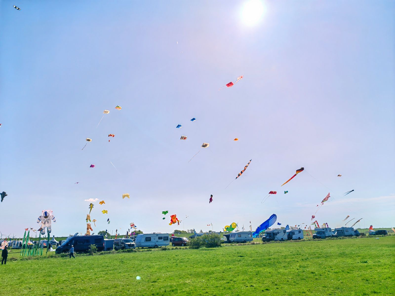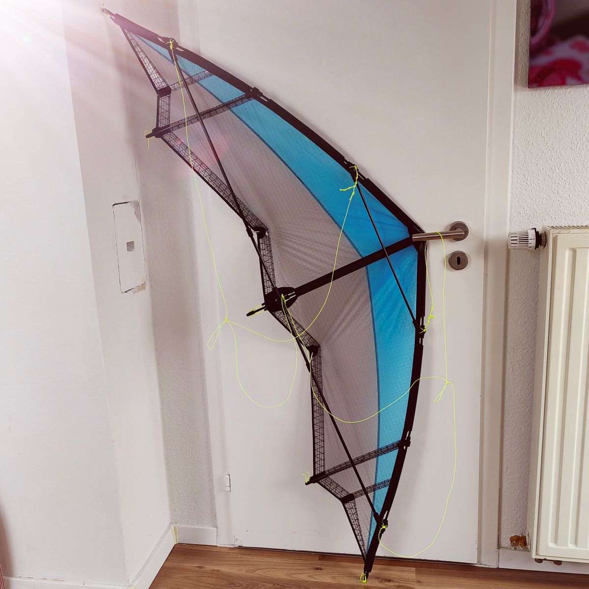 So, die Schantalle war heute noch mal auf der Wiese, konnte mich ein Stündchen loseisen. Der zweite Start gelang mir und sie nahm zügig Strömung an. Ließ sich toll fliegen und sah toll aus, klasse Vogel, Jörg! Nach ein paar Runden, die sie problemlos meisterte, wollte ich sie oben stehen lassen und dann ist sie aus der Strömung gefallen. Gut, dachte ich, einfach einen Knoten steiler. Allerdings habe ich sie nicht mehr gestartet bekommen, sie dreht grundsätzlich nach rechts trudelnd weg. Hab auch wieder zurück gestellt und alle Waage Maße auf Symmetrie geprüft. Auch der Bauch ist symmetrisch gleich tief auf beiden Segelseiten. Bin ein wenig ratlos, hab eingepackt und mir gedacht, ich schau zu Hause in Ruhe. Leinen hatte ich schon ausgeschlossen, gedreht und trotzdem trudelt dat Schantalle nach rechts.