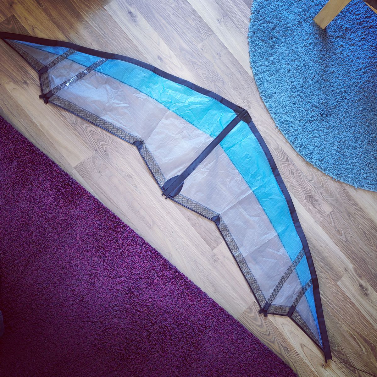 Ich hab endlich mein Segel fertig bekommen. Hab mit mir gehadert, da doch einige Fertigkeiten verloren gegangen sind und erst mal wieder angeeignet werden müssen. Aber - es ist fertig und auf den ersten und zweiten Blick auch symmetrisch.