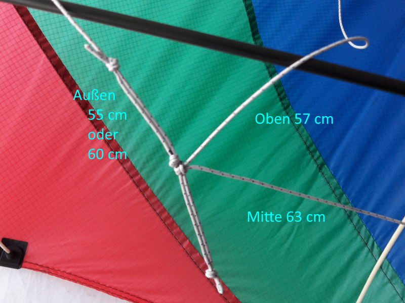 Das Magnet-Segel wirft, bedingt durch die Konstruktion der Nase, im oberen Bereich Falten. Wenn man sich verschiedene Nachbauten anschaut, sind diese Falten verschieden stark ausgeprägt. Also habe ich nochmal den Plan genommen und um die Verbinder-Ausschnitte ergänzt. Diese werden in der Beschreibung relativ zur Stopper-Position angegeben. Dann noch den oberen Leitkantenstab eingezeichnet und so theoretisch die Lage der unteren APAs bestimmt. Daraus ergibt sich ein Abstand von der Stopper-Position zum Stabende von ca. 32cm. Leichte Abweichungen beim Nähen der Nase können nun diesen Abstand beeinflussen. Auch die Verwendung verschieden dicker Endkappen auf den Leitkantenstäben in der Nase können diesen Abstand beeinflussen. Fazit: Wenn die APAs weiter unten sitzen, dann hat man mehr Falten oben im Segel und eine stärker nach unten gebogene Querspreize. Letztlich einen etwas anderen Drachen