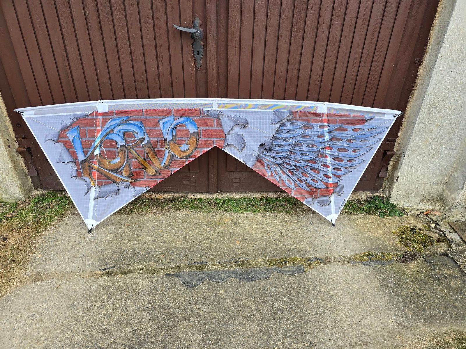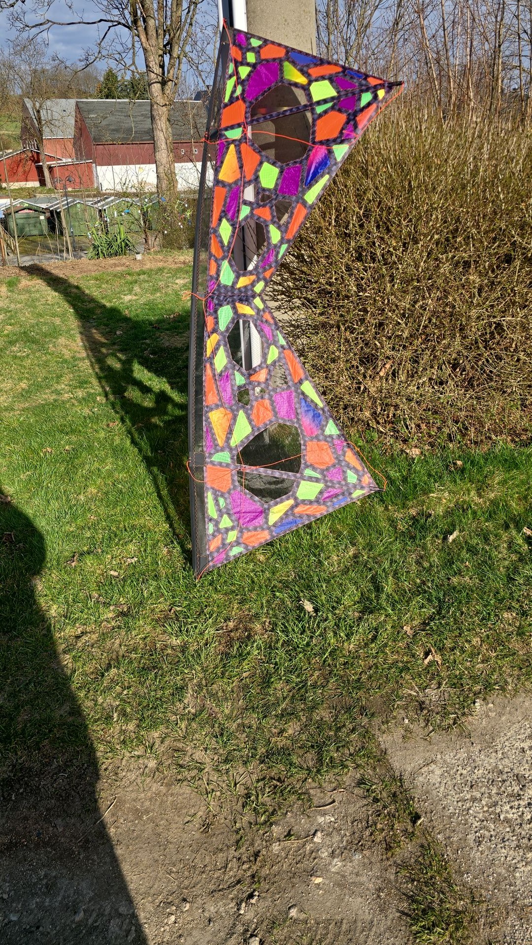 Ich würde die Abspannungen anders machen, da kann das Segel nicht richtig arbeiten, und du kannst ihn nicht von der toten Position starten. Das heißt, wenn er mit der Leitkante zu dir zeigt, geht es nicht. Sie ist normalerweise nach oben gebogen, damit der Wind drunter fahren kann. Aber das ist Geschmackssache.